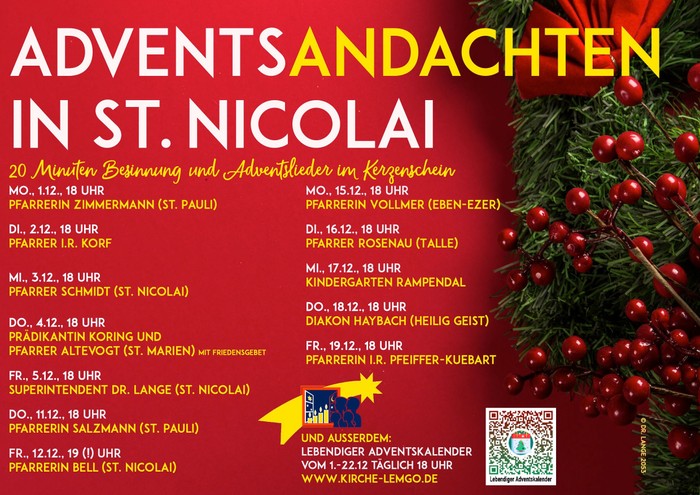 Auch in diesem Jahr laden die Lemgoer Stadtgemeinden zu Adventsandachten in die St. Nicolai-Kirche an. Montags bis freitags immer um 18 Uhr für 20 Minuten im Kerzenschein. Die Übersicht der Termine gibt es auch online auf https://www.nicolai-lemgo.de/kirche-in-lemgo.