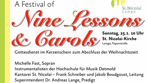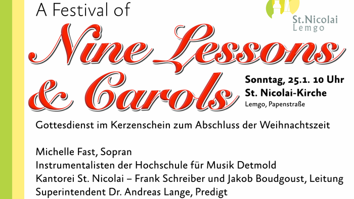 Am Sonntag, 25. Januar um 10 Uhr beschließen wir die Weihnachtszeit mit einer Lichterkirche. Darin wird die Kantorei Auszüge aus "A Festival of Nine Lessons and Carols" musizieren, der aktuelle Weihnachtspodcast aus St. Nicolai bietet einen Vorgeschmack, wie schön das klingen wird.