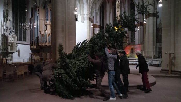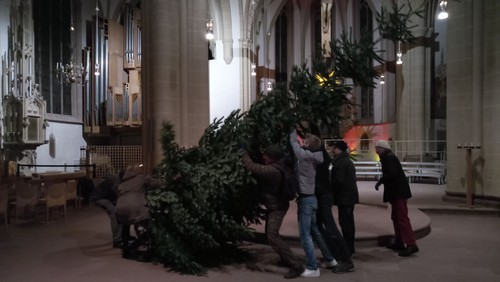 Am Freitagabend wurde der Weihnachtsbaum mit einigen Helfern aufgestellt – eine prächtige Tanne aus Lippe. Mit dabei war auch der ehemalige Freiwilligendienstler Jannik Dubbert.