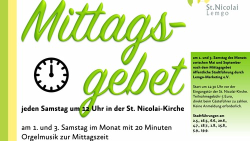 Am 1. und 3. Samstag im Monat lädt St. Nicolai zu einem Mittagsgebet mit Orgelmusik um 12 Uhr ein. Zwischen Mai und September bietet Lemgo-Marketing e.V. anschließend eine öffentliche Stadtführung an. Start ist um 12.30 Uhr vor der Eingangstür der St. Nicolai-Kirche. Eine Anmeldung ist nicht erforderlich. Der Rundgang dauert 90 Minuten.